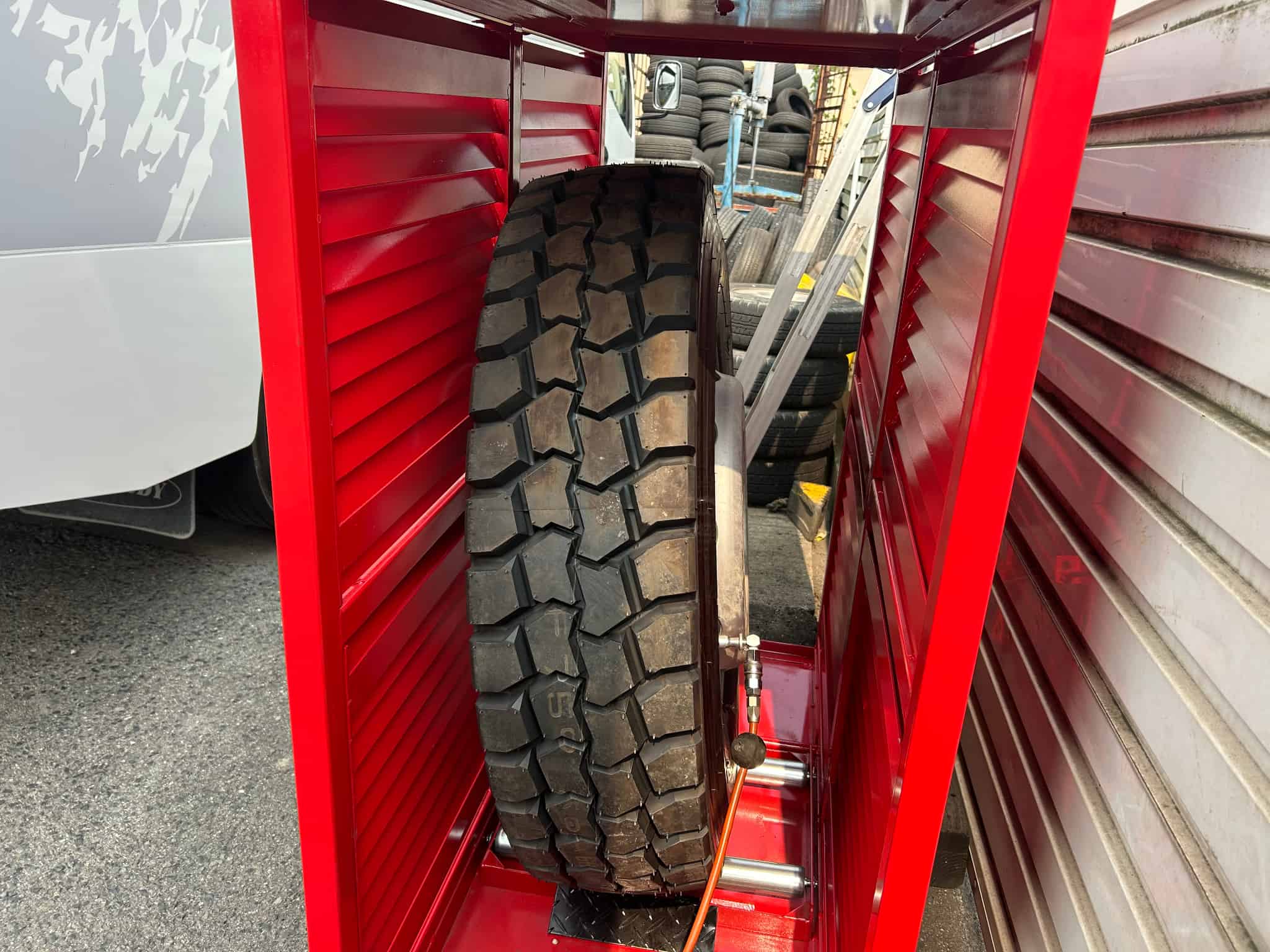 トラックタイヤ等は900KPa前後空気を入れる事もあり、 タイヤの空気充填中に万が一の破裂があると重大な人身事故になります。安全第一